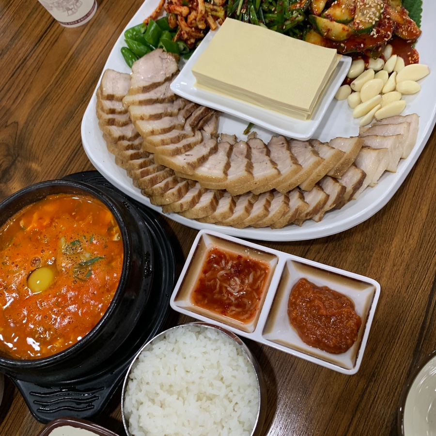 At Sugaseong near Jamsil Station, the bossam set comes with a generous and well-balanced table of dishes. The combination of dubu bossam, spicy sundubu stew, and carefully prepared side dishes makes the meal feel complete. Everything arrives hot and well balanced, creating a comforting and satisfying Korean meal.
