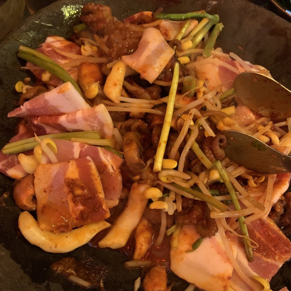 The pan comes loaded with pork belly, bean sprouts, chewy rice cakes, and green onions, all sizzling together in a thick, red sauce.